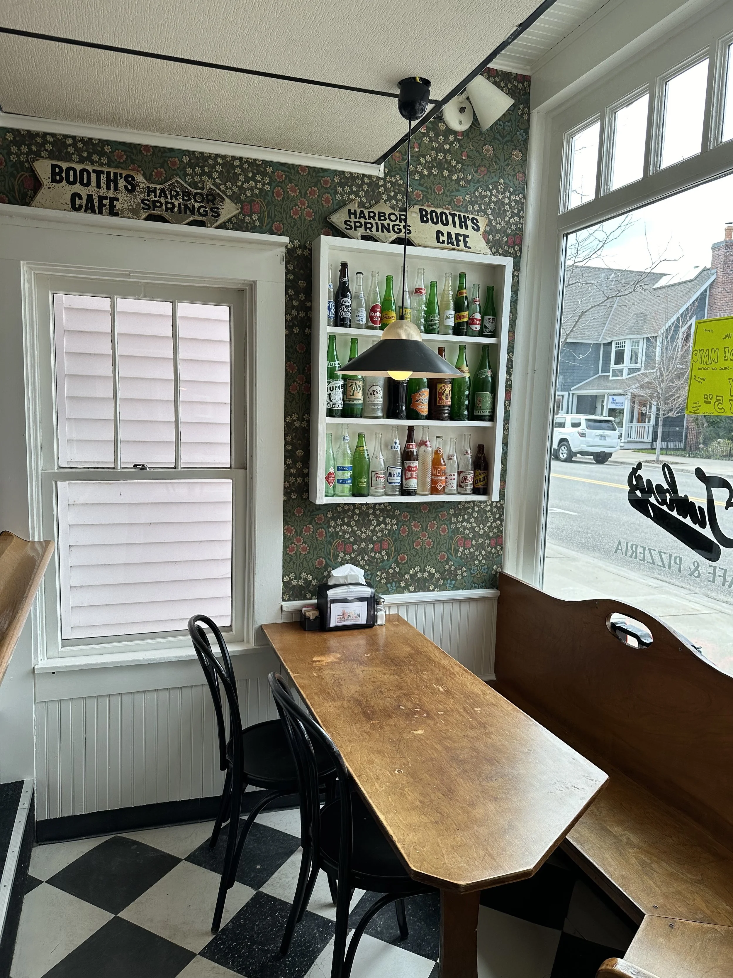 A restaurant menu with sections for pizzas, beer and wine, and specialty drinks, along with a historical black-and-white photo of a small town street and a cartoon of a man in a red car with a thank you note and a phone number.