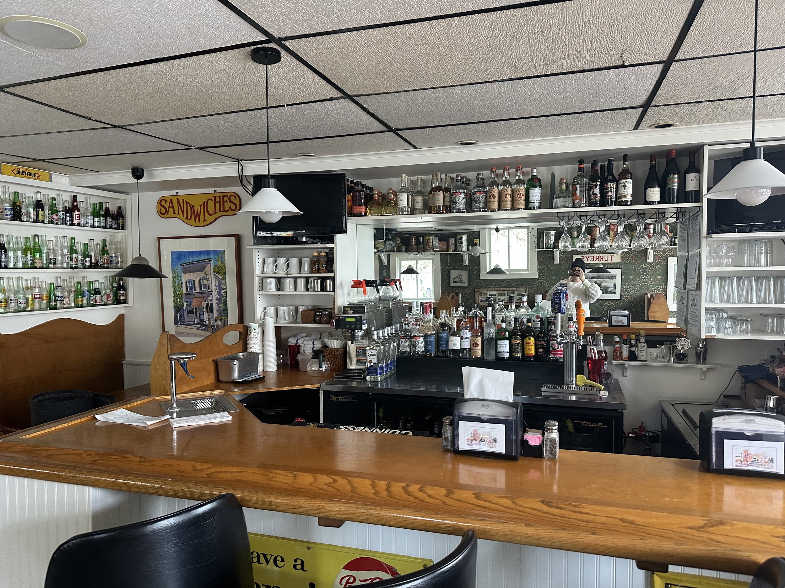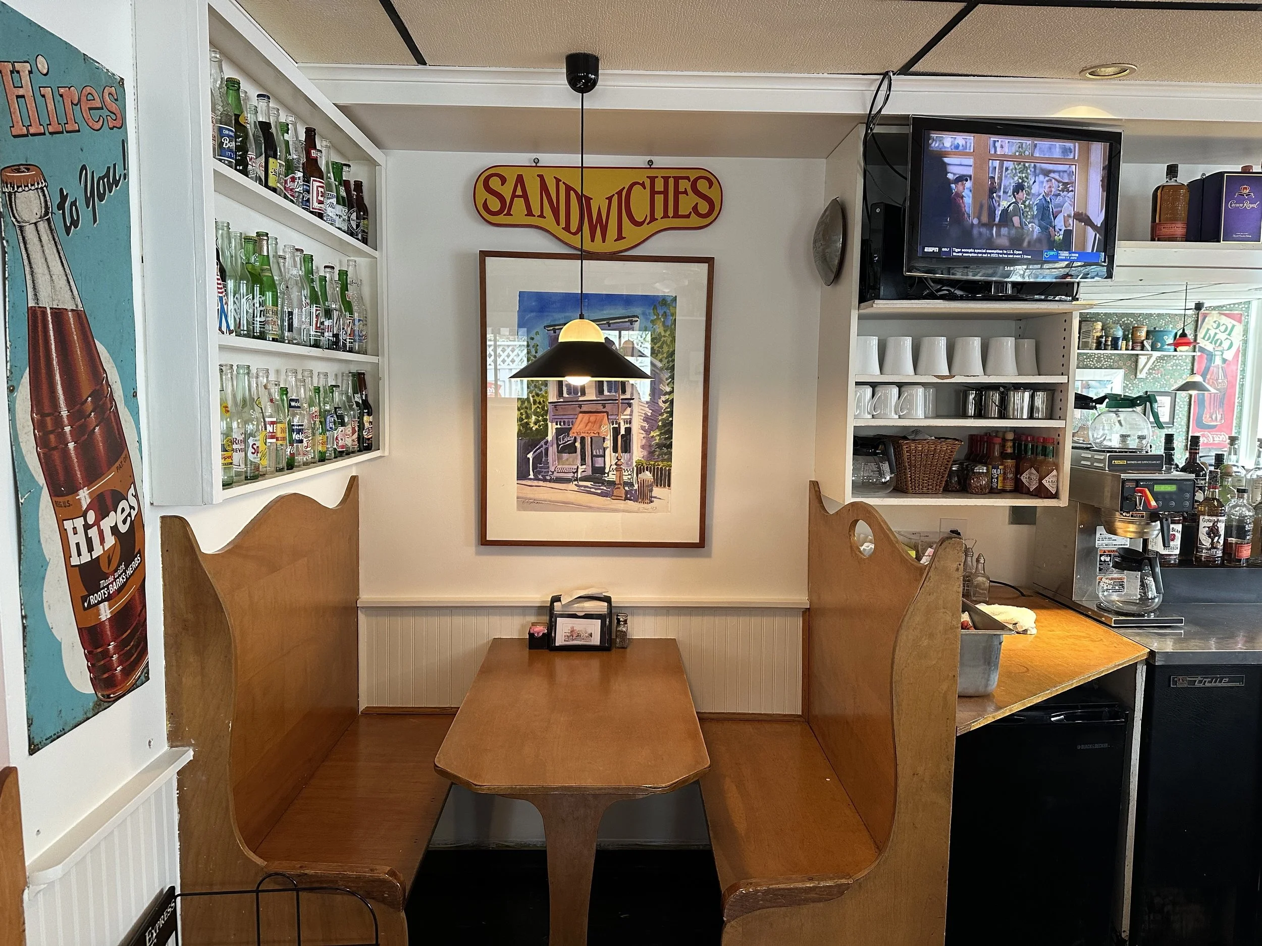Illustrated map of Turkey's Pizzeria restaurant with menu information, historical details about the building, and artist Kevin Barton at work.